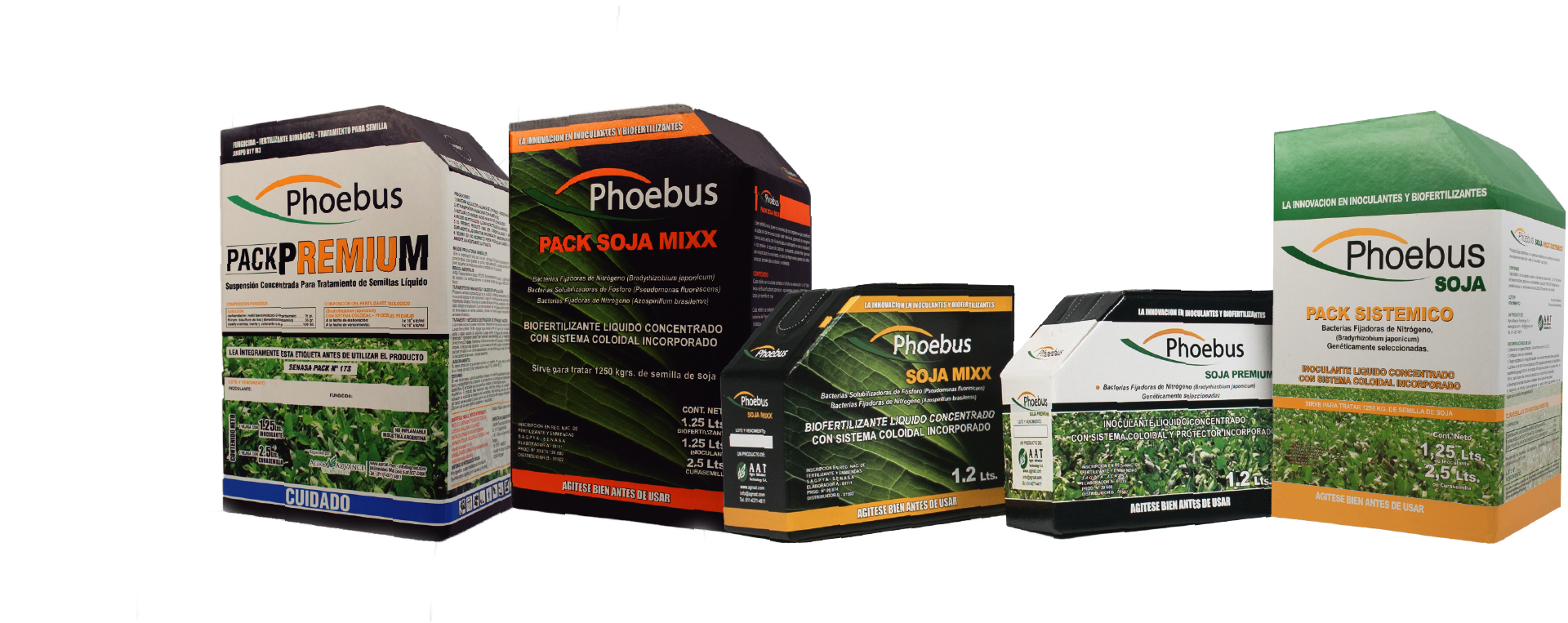 Presentación: 3 Bag in Box de 1.2 lts + 3 Bag in 50+50 ml / 50 kg box de Phoebus Premium 72 dosis Mix + 72 dosis soja Premium 3600 kg de semilla